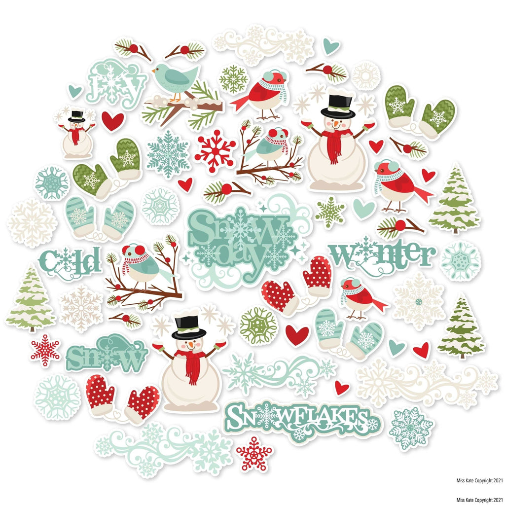 The Winter Wonderland Die Cut Pack has a wide variety of designs including "Snow day" "Winter" "Snow" "Snowflakes" "Joy" "Cold" Titles. Shapes include Swirl of Snowflakes, Snowflakes, Hearts, Pinetree, Berries, Birds, Mittens, Snowmen, Christmas tree.