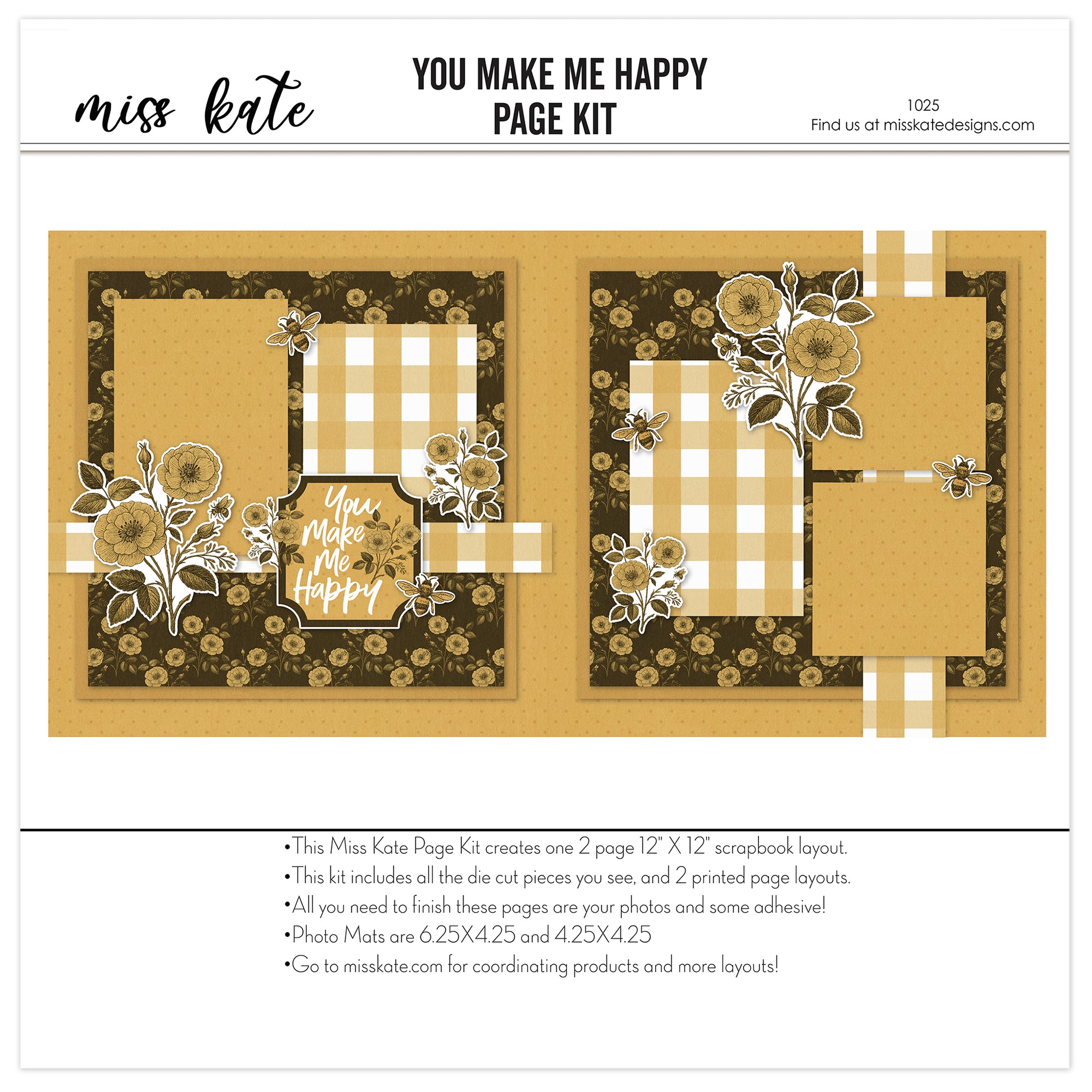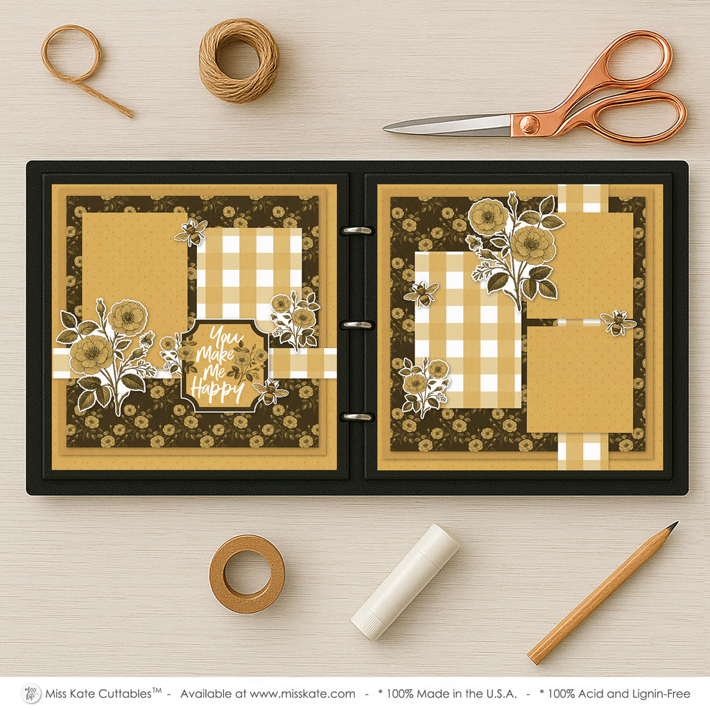 This scrapbook layout radiates warm vintage charm with its honey-gold color palette and elegant floral theme. The design features two coordinated pages filled with intricate botanical illustrations of blooming roses and buzzing bees, all rendered in a rich sepia tone. A soft gingham pattern in cream and gold adds a cozy, rustic touch, while the darker floral background frames each section beautifully, giving the layout depth and contrast. The left page highlights the phrase “You Make Me Happy” in a handwritten script within a decorative label, surrounded by layered flowers and bees that bring a sense of movement and life. The right page continues the floral and bee motif, providing generous photo spaces bordered by coordinating patterns. Together, the pages evoke a timeless, handcrafted feel — perfect for capturing moments of gratitude, nature, and joy.