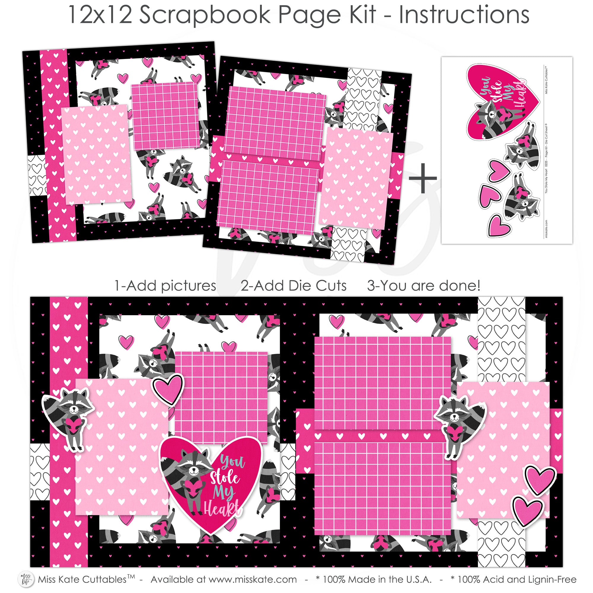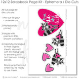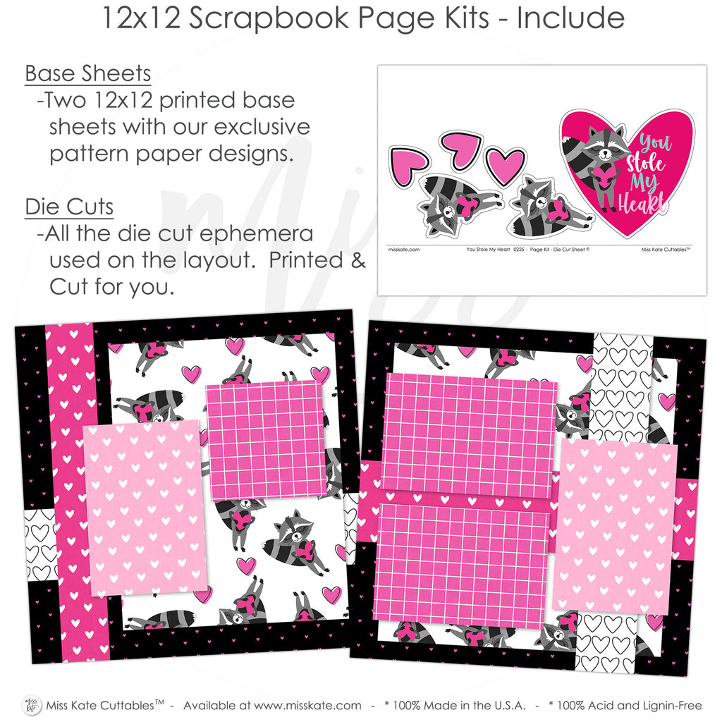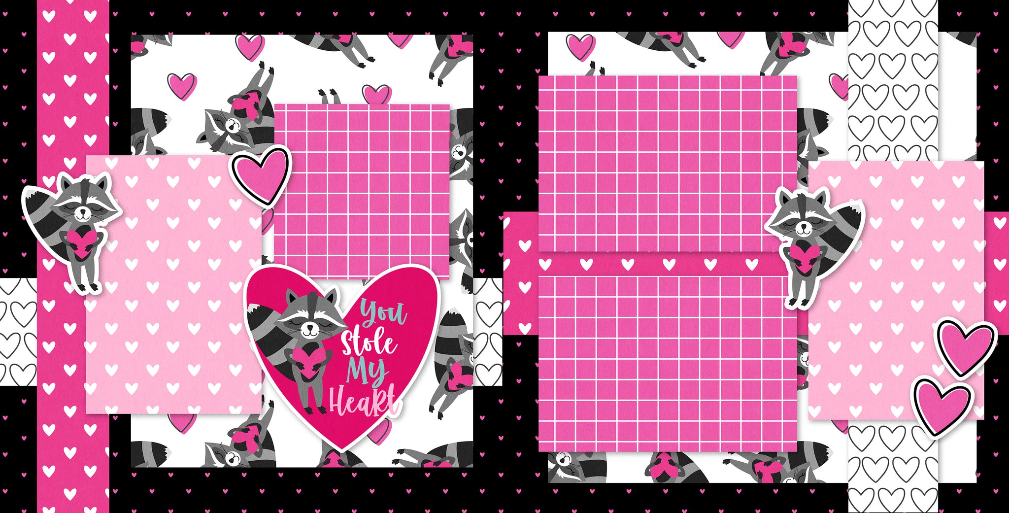 This 12x12 scrapbook page kit features a raccoon and heart theme, perfect for love-filled moments like Valentine's Day, anniversaries, or sweet memories. The black and pink color scheme highlights adorable raccoons and heart patterns, offering a charming design for layering photos. The kit includes pre-cut die-cuts, decorative elements, and coordinating backgrounds, making it ideal for capturing romantic occasions, date nights, or handmade gifts. Here is what you get in our Page Kits