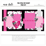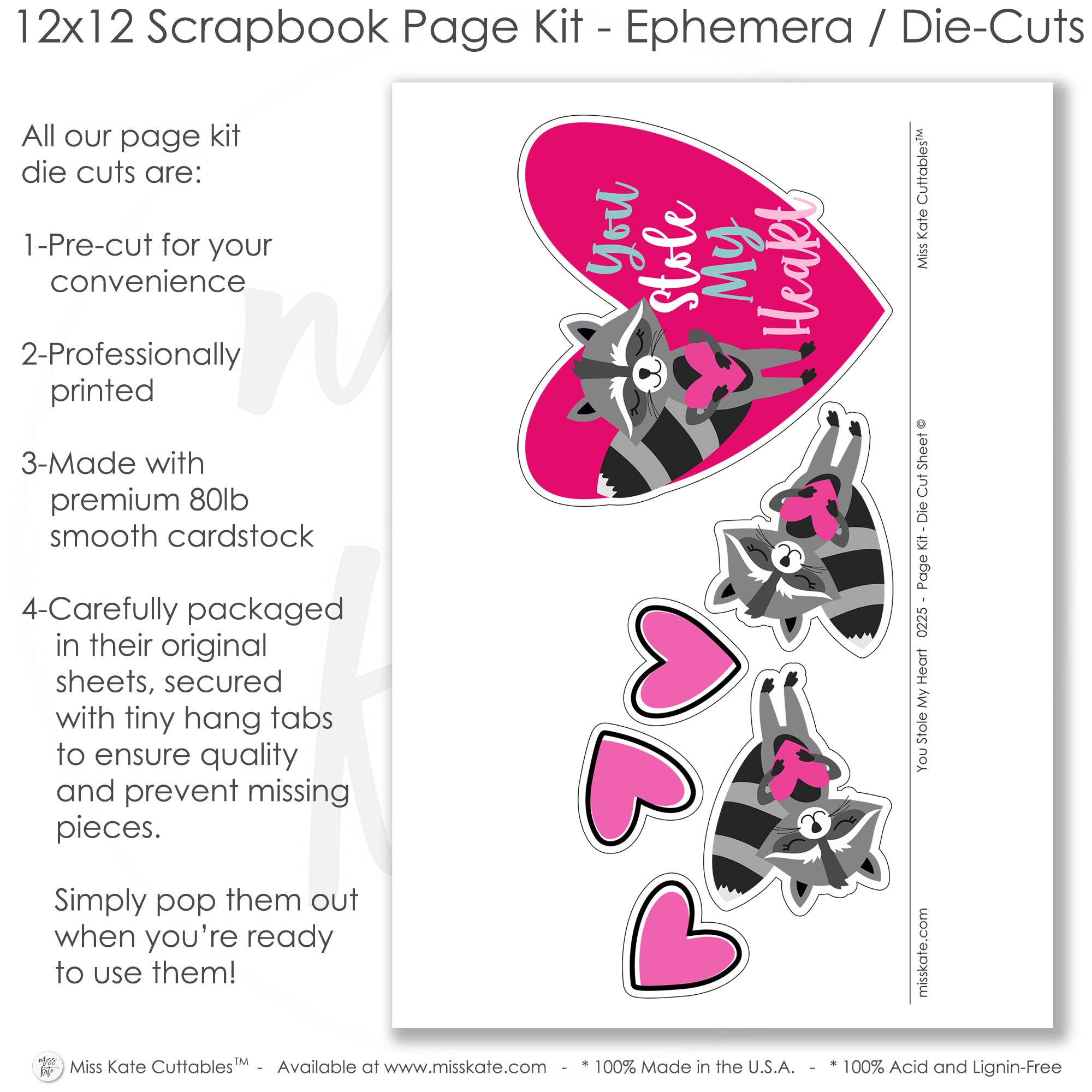Die Cuts: Raccoon holding a heart, large pink heart with "You Stole My Heart" text, small pink heart, medium pink heart, raccoon with open arms. All the die cuts you see on our layout picture, all cut out for you and ready to embellish your page kit!